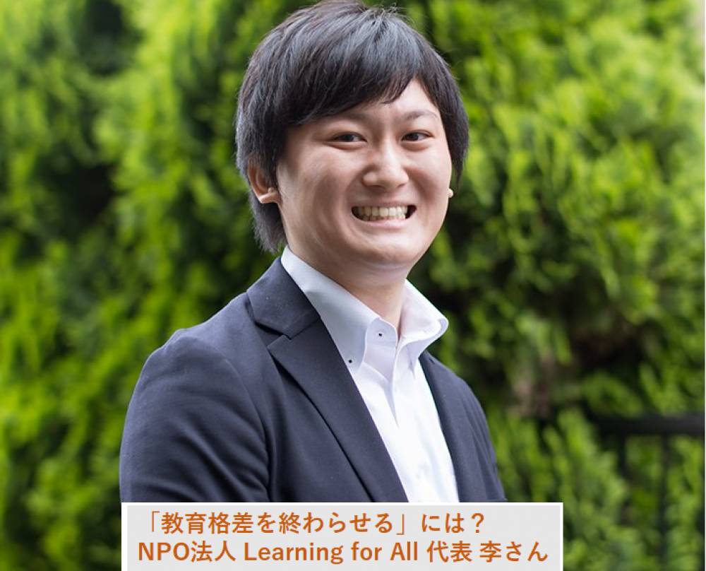 「教育格差を終わらせる」という理念を掲げこの問題に取り組んでいるのがNPO法人 Learning for All代表の李炯植さんです。