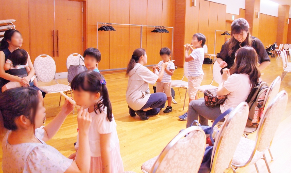 年長さんや小学生なら、ひとりで鳴らしてみよう!「ひとりでは無理かな」という小さな子には大人が隣でサポートを。0歳さんも、抱っこで参加しています。