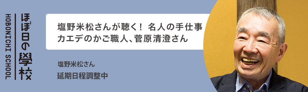 聞き手は、山や海、工房で職人や名人の話に耳を傾けてきた聞き書きの名手、塩野米松さん。「活字になる前、話を聞くその時間が、一番面白い」と塩野さんが語る、その生の現場を体験するシリーズ講座です。
