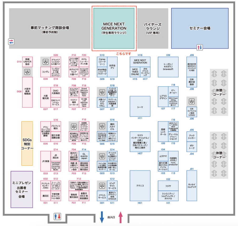 2.会場内の「MICE NEXT GENERATION」学生専用ラウンジに受付時間までにお越しください。受付にて「参加プログラム名/お名前」をお伝えいただきましたら、事務局が各プログラムにアテンドいたします。
