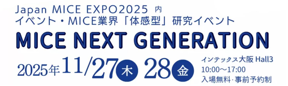 イベント・MICE業界「体感型」研究イベント【MICE NEXT GENERATION 】は、2025年11月27日(木)・28日(金)の2日間、インテックス大阪3号館で開催される展示会「Japan MICE EXPO 2025」の産学連携特別企画です。