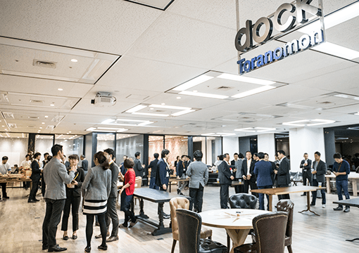 1階正面ロビーの受付(守衛)にて「4階のdocks(ドックス)に来ました」とお伝え下さい。