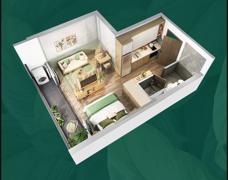 Ban công rộng, khu phòng ngủ và phòng tắm được thiết kế riêng biệt giúp gia chủ có không gian riêng tư. Giá của căn hộ này chỉ nhỉnh hơn studio chút từ 1.5-1.9 tỷ đồng.