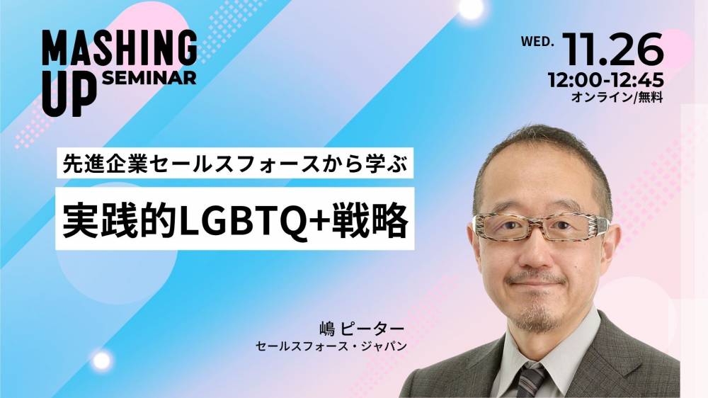 今回のセミナーでは、LGBTQ+に関して先進的取り組みをしているセールスフォース・ジャパンの嶋ピーターさんをゲストにお招きし、LGBTQ+の取り組みが企業価値向上やイノベーション創出につながる理由、全社を巻き込む活動、制度など環境整備への取り組みなど具体的施策も交えてお話しいただきます。