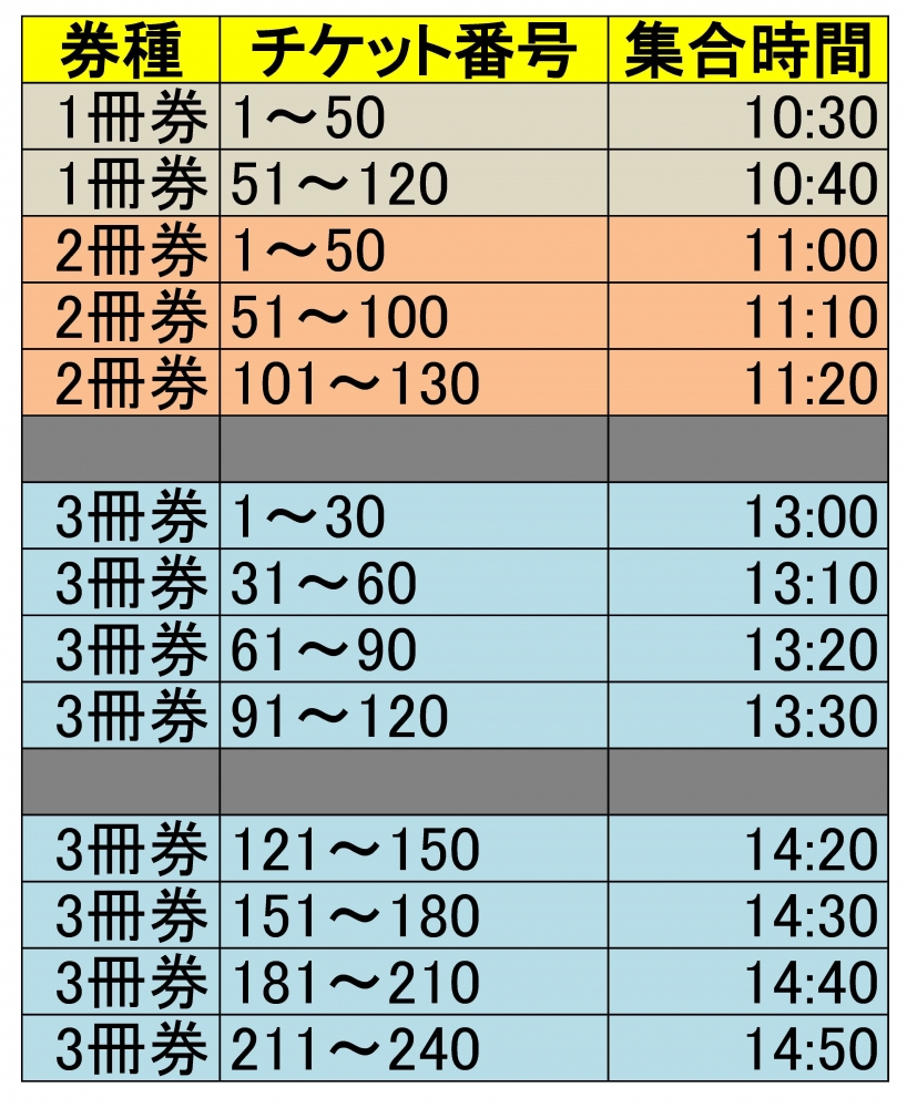 ご案内は集合時間ごとのお並び順となります。チケットの番号順ではございません。あらかじめご了承ください。