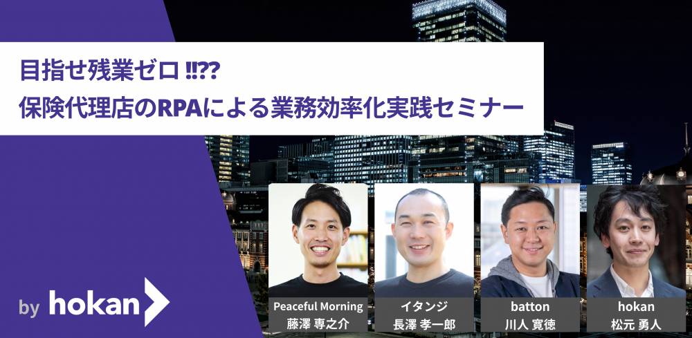 後半はノーコード RPA サービスを展開する株式会社 batton と保険代理店向け顧客管理システムを提供する hokan より、保険代理店の業務・システム入力における RPA 活用により、業務の生産性向上やデータ活用につなげた事例をご紹介します。