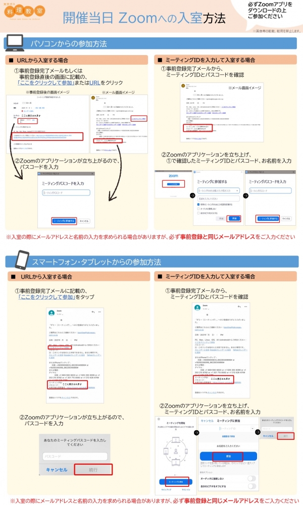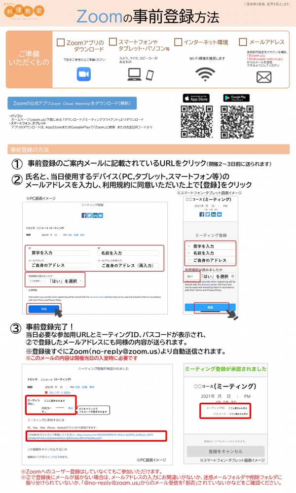 開始日までにZoom事前登録をしていただき、入室に必要なミーティングIDとパスコードを取得ください(事前登録後お使いのアドレス宛てにZoomより自動送信されます)。
