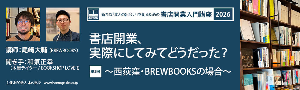 近年、書店が減少している一方で、個性豊かな小さな書店や、カフェ、雑貨店に併設された本売り場などが続々と誕生しています。この講座では、実際に書店をオープンした方をゲストに迎え、本屋ライターの和氣正幸さんが開業までの道のりやリアルな苦労をお聞きします。 今回は、西荻窪で「BREWBOOKS」を立ち上げた尾崎大輔さんに、書店を始めるための具体的なノウハウを深掘りしていただきます。物件選びから資金計画、本の仕入れ、イベントやZINEの発行はもちろん、気になる売上などの具体的な数字も交えながら、実践的なお話を聞ける貴重な機会です。 「自分でもいつか書店を立ち上げてみたい!」と考えている方から、書店や出版業界に興味がある方まで、幅広くおすすめできる講座です。