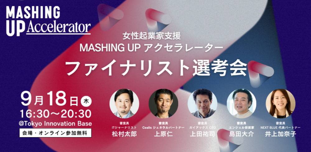 若手起業家の可能性を引き出す育成プログラム「Mashing Up アクセラレーター」。その第2ステージにあたるファイナリスト選考会を、2025年9月18日(木)に、Tokyo Innovation Base(有楽町)にて開催します。