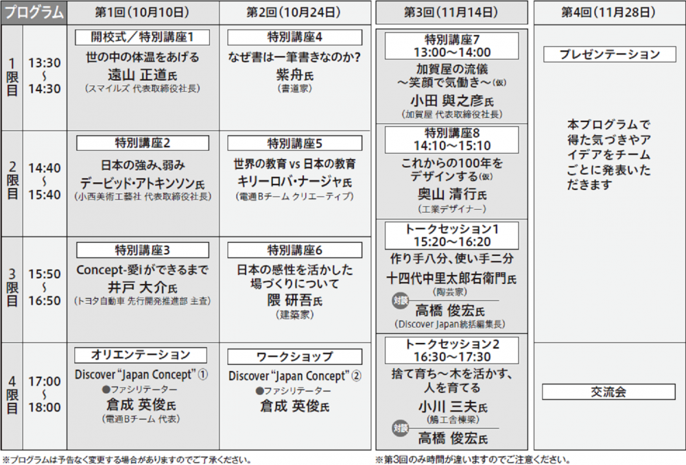 舞台は江戸時代に文化や日本各地の商品が集まり、情報を発信し続けてきた「日本橋」。講師は伝統を受け継ぐ職人や、日本人ならではの感覚を活かし世界で活躍するクリエイターの方々など。チーム単位でお申し込みください。最終回で各チームにアイデアや気づきなどを発表いただきます。日本の強みを活かしたイノベーションの創出、その人材の育成を目的に開催します。