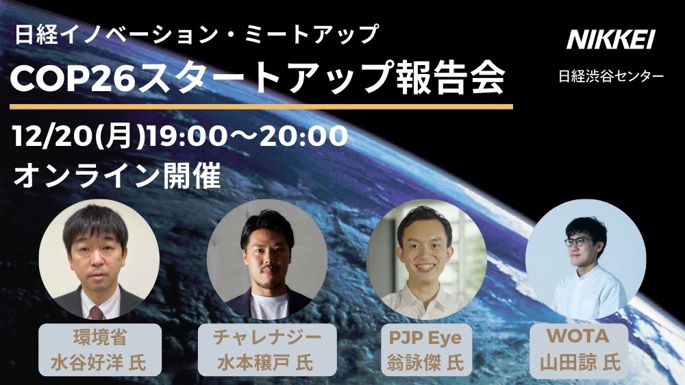 第26回国連気候変動枠組み条約締約国会議(COP26)に出展したスタートアップらによる報告会です。11月初旬に英国で開いたCOP26には、日本からも環境関連スタートアップが複数出展しました。現地で開催されたピッチコンテストで2位に入賞した、新しい炭素バッテリーのPJP Eyeや、英国王立財団によって創設された環境賞「アースショット賞」においてファイナリストに選出されたWOTAなど、存在感を発揮したスタートアップもいました。これらのスタートアップに、環境に配慮した自社事業について紹介してもらうほか、現地で展示・発表した体験談や成果も報告してもらいます。