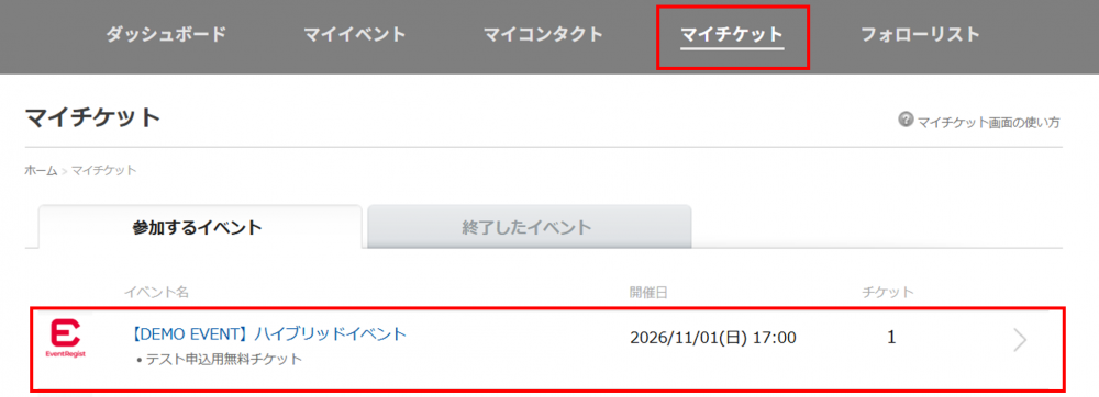 1. ご登録後、EventRegistにログインしたまま、「マイチケット」画面にアクセスしてください。