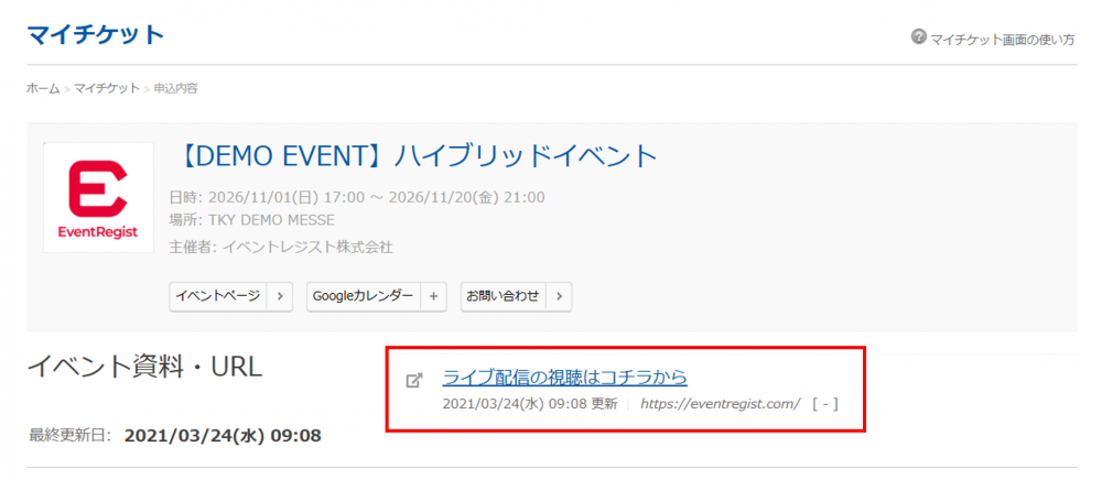 2. ご登録いただいた【DEMO EVENT】ハイブリッドイベントのチケットを選択してください。
