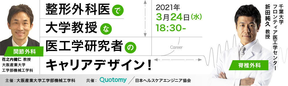 千葉大学フロンティア医工学センター教授にご就任された脊椎外科医 折田純久先生をお招きし、大阪産業大学工学部 機械工学科教授・関節外科医 花之内健仁先生とのトークセッションを展開していただく企画です。