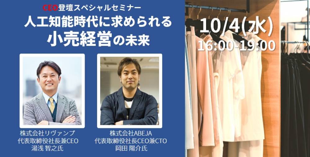 【参加無料/好評につき第2回開催】「人工知能時代に求められる小売経営の未来」-データ活用で小売業界は大きく変わる- 登壇:リヴァンプ CEO湯浅氏・ABEJA CEO岡田氏