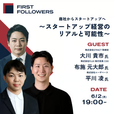 今回のFirst Followersでは、伊藤忠商事・三菱商事でのキャリアを経て、スタートアップの事業推進・資金調達・経営戦略に挑む二人の取締役、大川 貴市氏(株式会社STRACT)と布施 元大郎氏(株式会社FLUX)をゲストに迎えます。