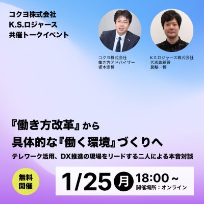 テレワーク活用、DX化など多様化する働き方について、コクヨ株式会社より、働き方アドバイザーとして数多く研修を担当する坂本 崇博氏と創業時からフルリモートワークの K.S.ロジャース株式会社 民輪一博による、現場のノウハウや事例を対談形式でお届けし...